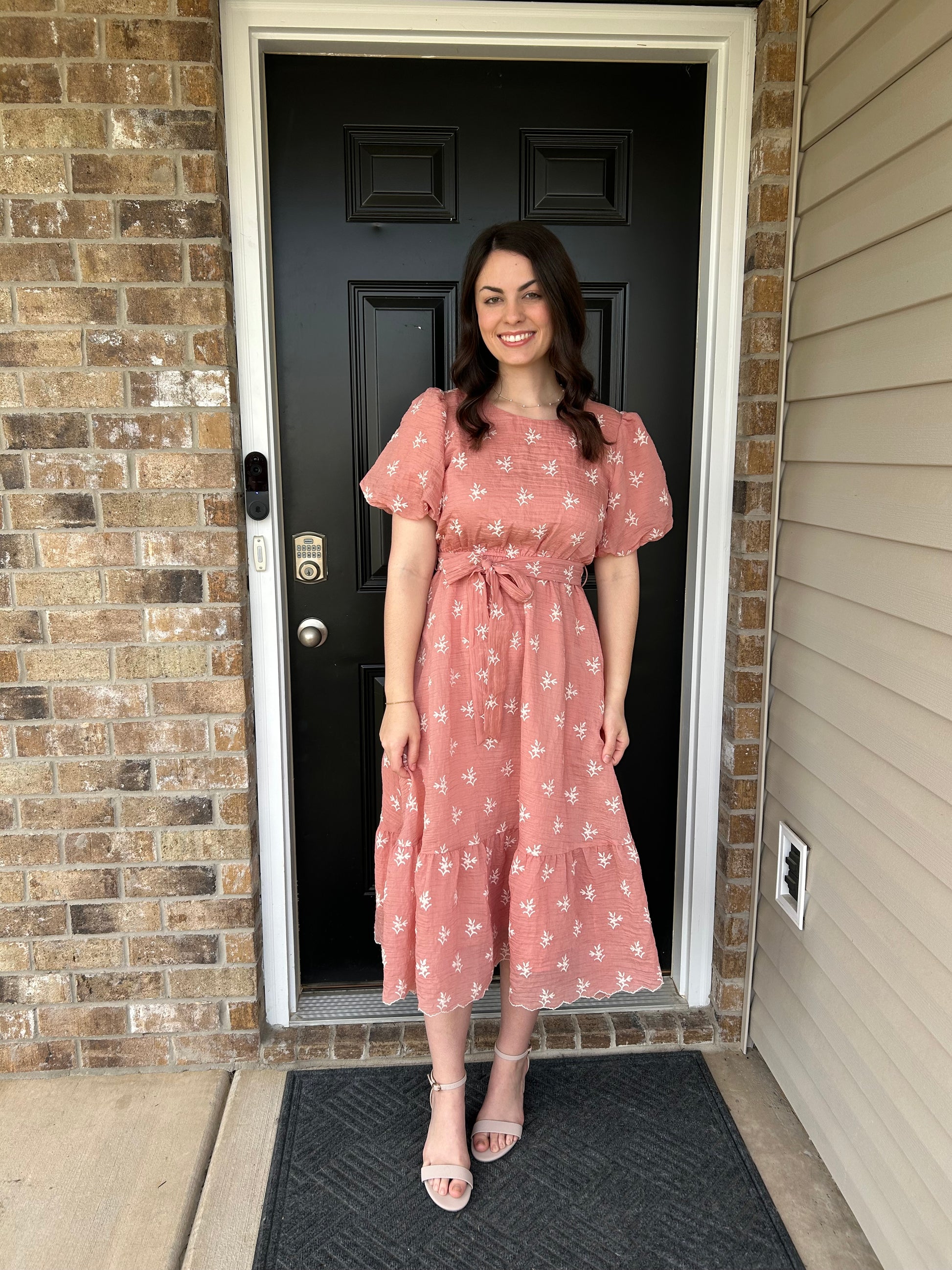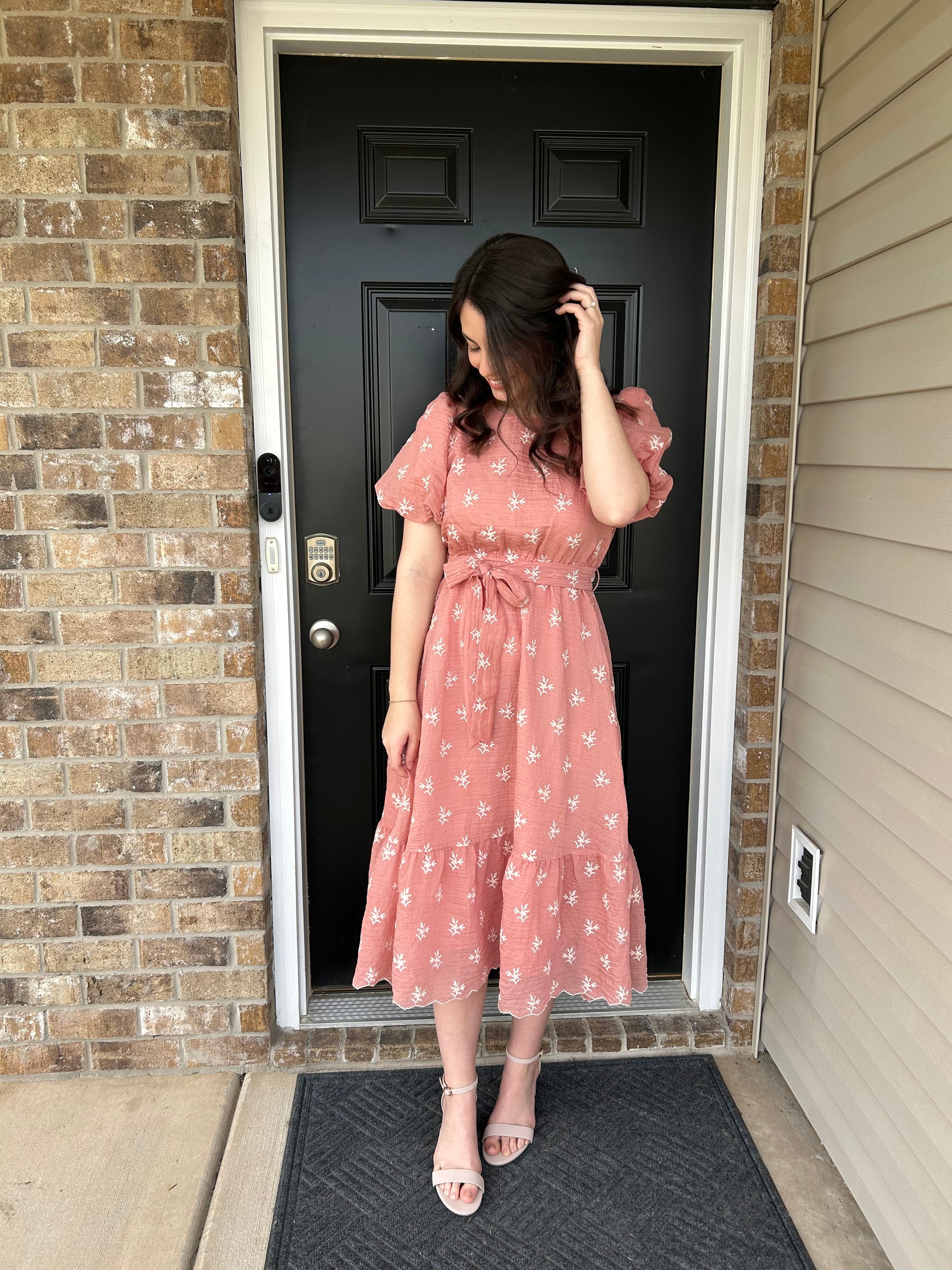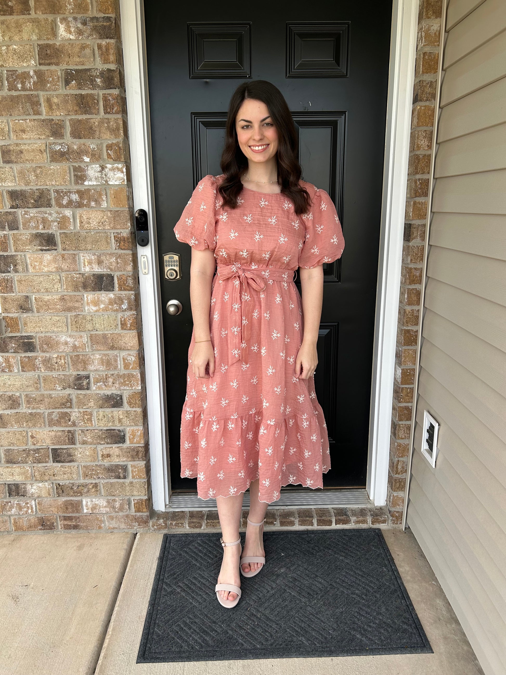 The model is 5’ 5” wearing a size small. The dress is true to size.